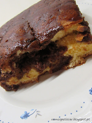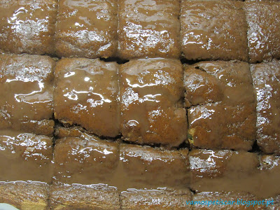 Cortar o bolo em quadrados e regar o com o molho de chocolate.