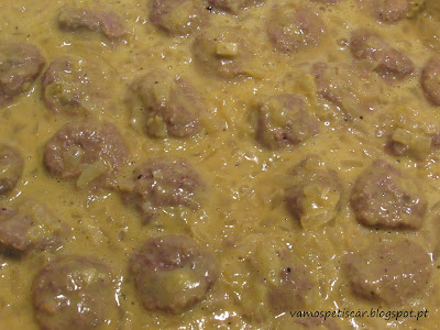 Quando a cebola estiver translúcida, acrescentar o vinho branco, a água e as almôndegas. Temperar de sal e pimenta preta acabada de moer a gosto.