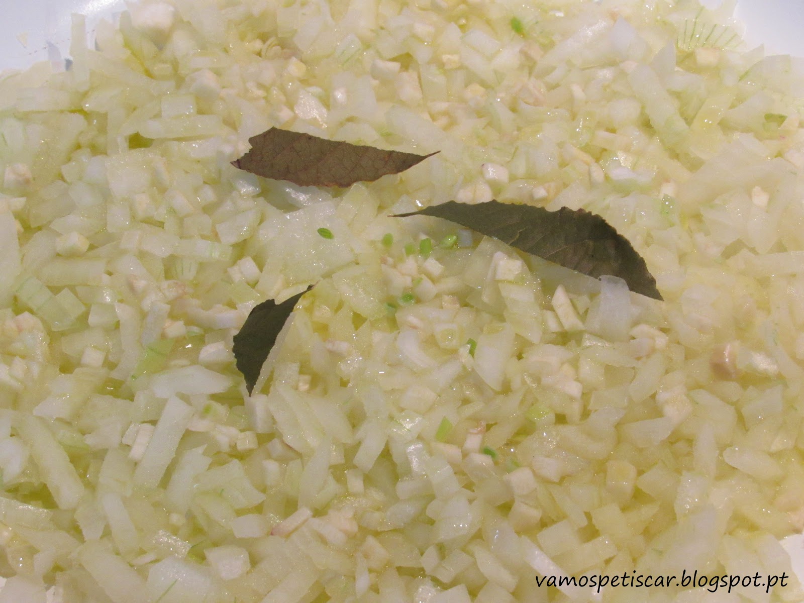 Levar ao lume um tacho largo ou frigideira, com a cebola e os dentes de alho picados, o azeite e a folha de louro.