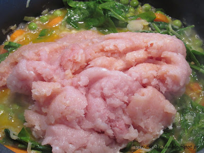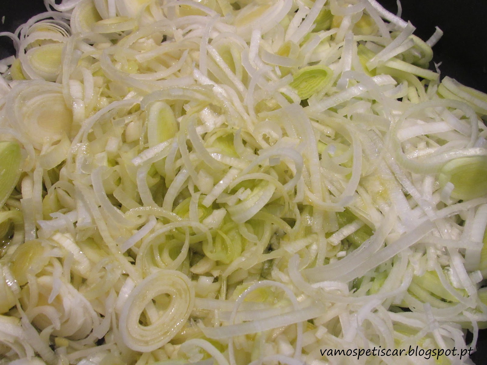 Num tacho colocar alourar no azeite o alho francês cortado às rodelas e os dentes de alho finamente picados.