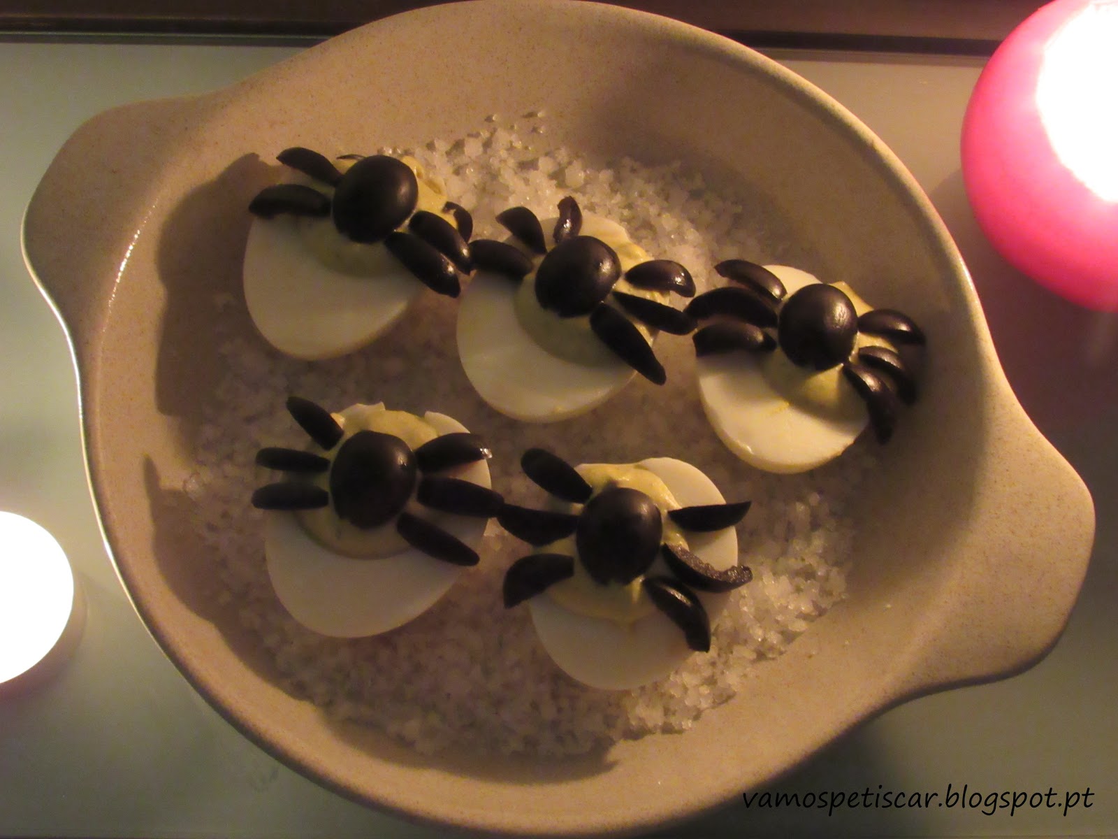 Cortar as azeitonas e decorar os ovos dando o formato de aranhas.