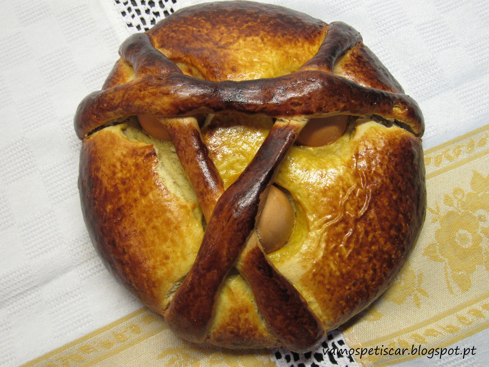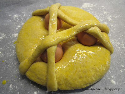 Formar 3 cordões (pequena porção de massa reservada) e colocar sobre o folar de modo a prender os ovos e dobrar as pontas dos cordões de modo a ficar por baixo do folar.