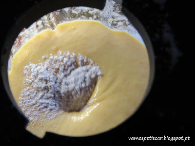 Com o liquidificador a trabalhar, colocar a farinha com o fermento (previamente peneirados) aos poucos.