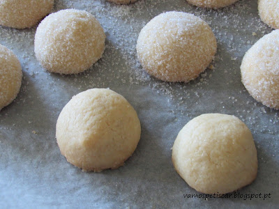 Moldar bolinhas e colocar num tabuleiro de forno, forrado com papel vegetal.