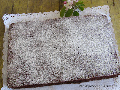 Deitar a massa numa forma rectangular forrada com papel vegetal (ou untada de manteiga e polvilhada de farinha).