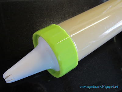 - Para fazer as farturas usei o dispara-biscoitos com um bico frisado. Pressionando o botão de mola e empurrando a manivela para a frente até sair a quantidade de massa pretendida.