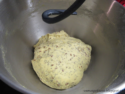 Quando a massa estiver bem homogénea juntar a massa de fermento e as sementes e amassar por mais uns minutos.