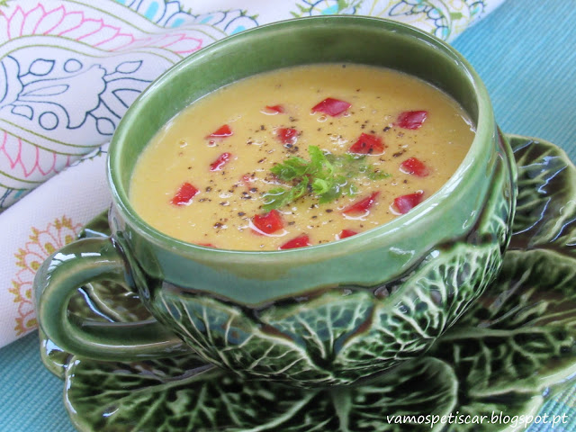 Servir de imediato com pimento vermelho cortado ao cubinho, pimenta preta acabada de moer e cerefólio finamente picado.