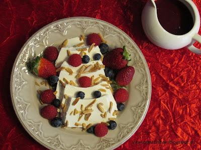 • Uma opção é servir com Coulis de Frutos Vermelhos. Colocar num tacho 250g de Frutos Vermelhos Congelados, 1 c.sopa de Mel, 1 pau de Canela e 1 c.sobremesa de Sumo de Limão. Deixar em lume médio-baixo até a fruta cozinhar. Retirar o pau de canela e triturar a fruta. Passar por um passador e reservar o coulis até arrefecer. Servir fresco.